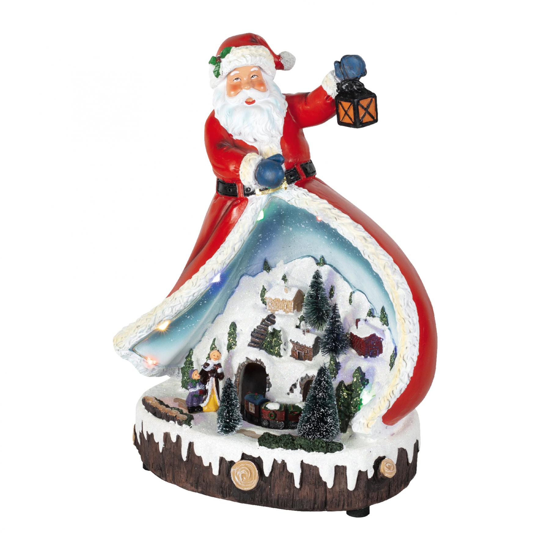 Ez a beltéri kivitelű, színes LED világítással ellátott dísz egy körbejáró kisvonattal kápráztatja el látogatóit, miközben a háttérből kellemes karácsonyi dallam szól. A termék választhatóan néma üzemmódban is képes működni. A tápellátást 3 x 1,5 V (AA) elem biztosítja, melyek nem tartozékok.