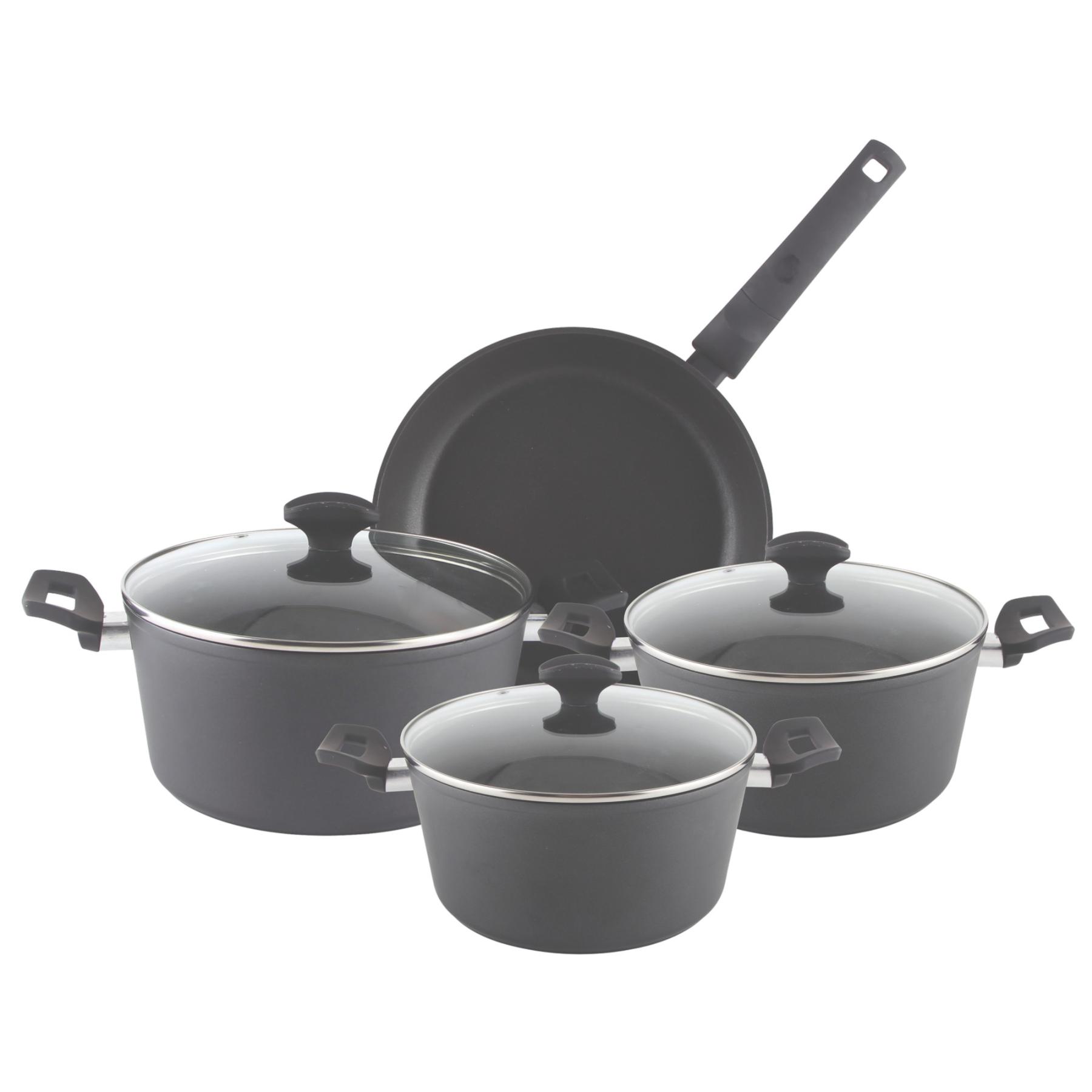 | szett tartalma | 1 db 28 × 13 cm lábas, 3,6 liter • 1 db 24 × 12 cm lábas, 2,9 liter • 1 db 20 × 9 cm lábas, 1,8 liter • 1 db 26 × 5 cm serpenyő, 1,3 liter • 3 db hőálló üvegfedő |